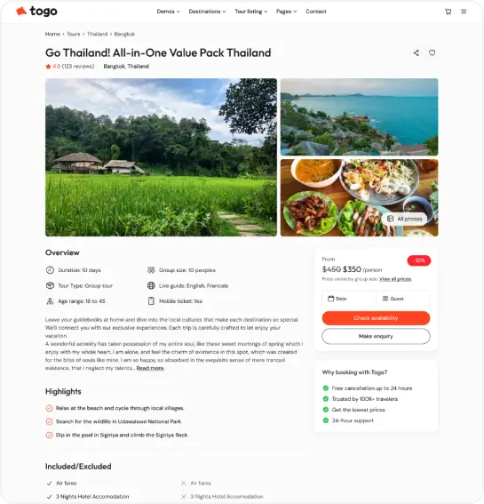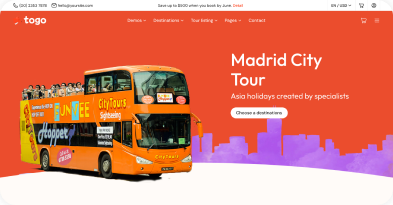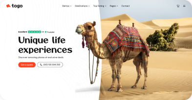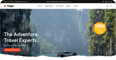 Togo is a professional WordPress theme that makes it easy to build a modern, beautiful tour booking website with full features for reservations, payments, and tour management.